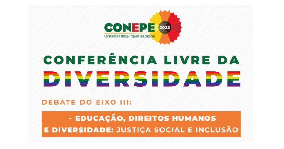A Conferência Livre da Diversidade acontece no dia 15 de março e vai debater educação, direitos humanos, diversidade, justiça social e inclusão. O encontro é uma etapa da Conepe – Conferência Estadual de Popular de Educação e acontecerá de maneira virtual, das 19 às 21h, na plataforma Zoom.