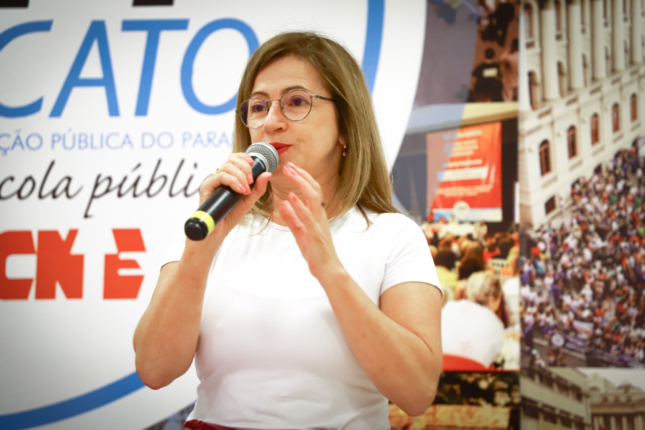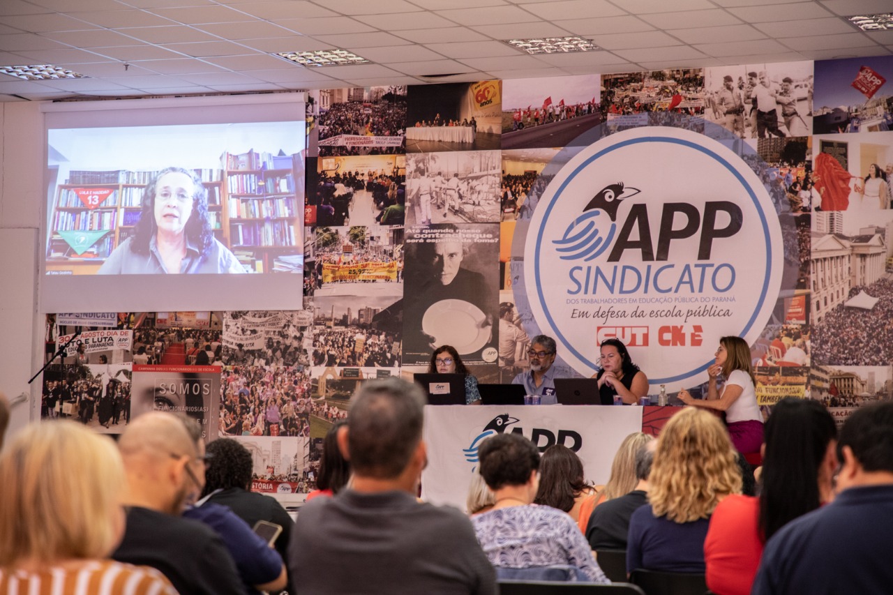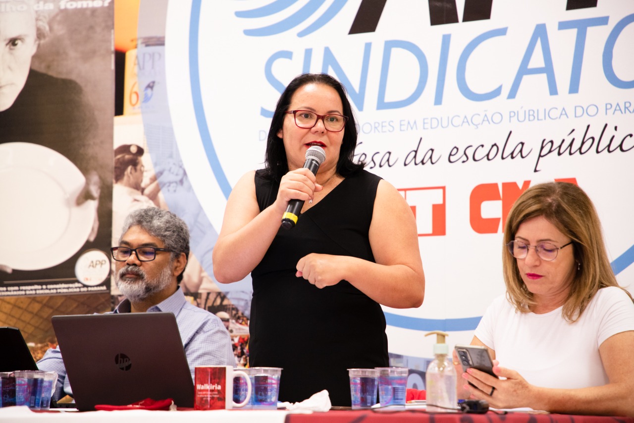 Já sobre conjuntura estadual, a presidenta da APP-Sindicato Walkiria Olegário Mazeto, apontou os principais desafios na luta pela implementação de políticas educacionais que fortaleçam a emancipação dos(as) estudantes em detrimento das políticas tecnocráticas instituídas pelo governo Ratinho Jr.