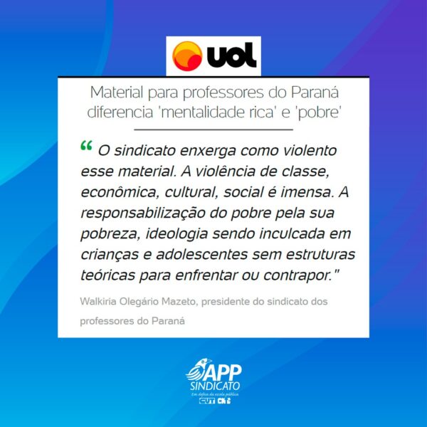 Logo que tomou conhecimento dos materiais de apoio aos alunos do sexto ano, a APP se posicionou contra o enfoque que vende a ilusão de que é possível sair da miséria apenas com força de vontade. “Ideologia de herdeiro, autoajuda barata e coach quântico substituindo as ciências sociais e o debate real sobre as raízes da pobreza. A profundidade de um pires”, publicou a APP.