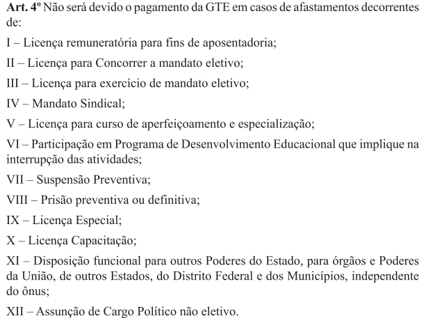 – Por fim, o pagamento da GTE não será devido em caso de licença especial e mesmo em interrupções ocasionadas por curso de formação, como o PDE. Reproduzimos abaixo os casos de afastamento listados no decreto: