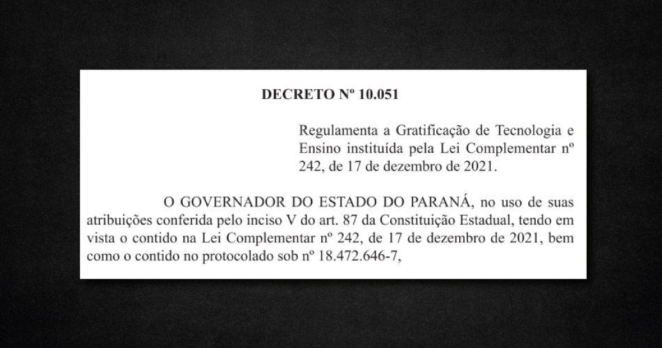 O governo do Paraná publicou no Diário Oficial o Decreto nº 10.051, regulamentando a Gratificação de Tecnologia e Ensino (GTE) aprovada no final de dezembro e correspondente ao valor de R$ 800 para 40h.