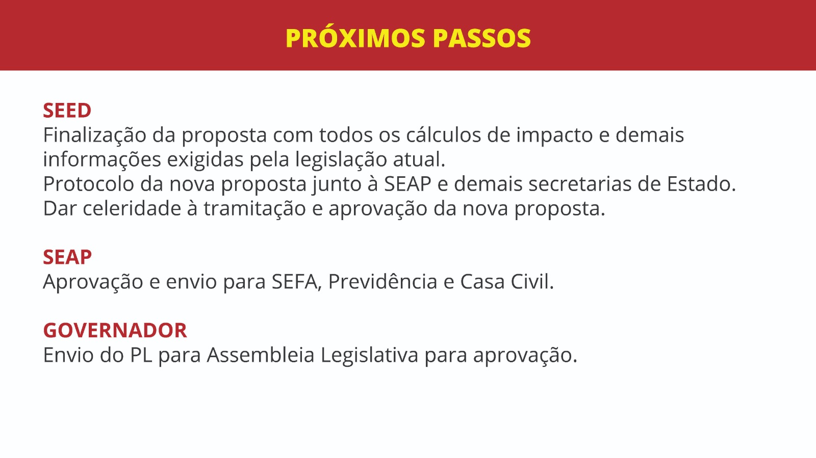 O plano é protocolar o projeto junto à Secretaria de Administração e Previdência (Seap) apenas com a certeza da aprovação. Após o aval da Seap, da Fazenda e do governador, a proposta deve passar por votação na Assembleia Legislativa (Alep).