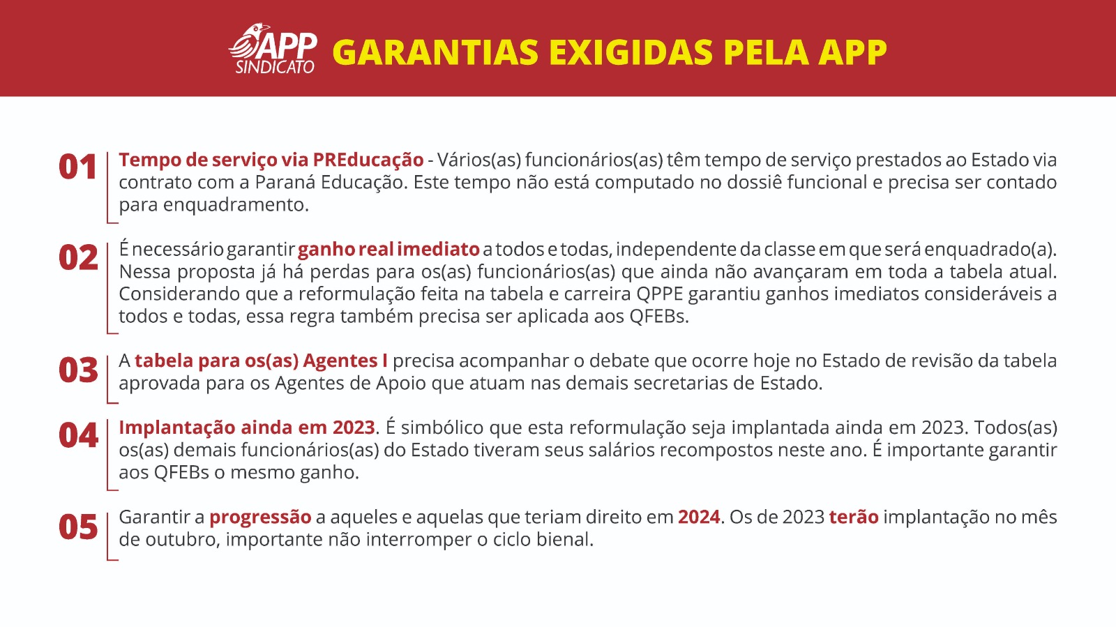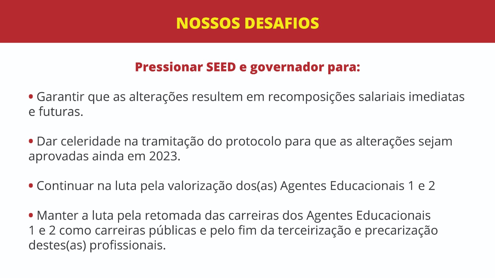 Entre os pontos de incerteza, está a proposição de uma tabela diferenciada para os(as) Agentes I, uma vez que a proposta aprovada para os(as) QPPE é considerada muito inferior ao esperado.