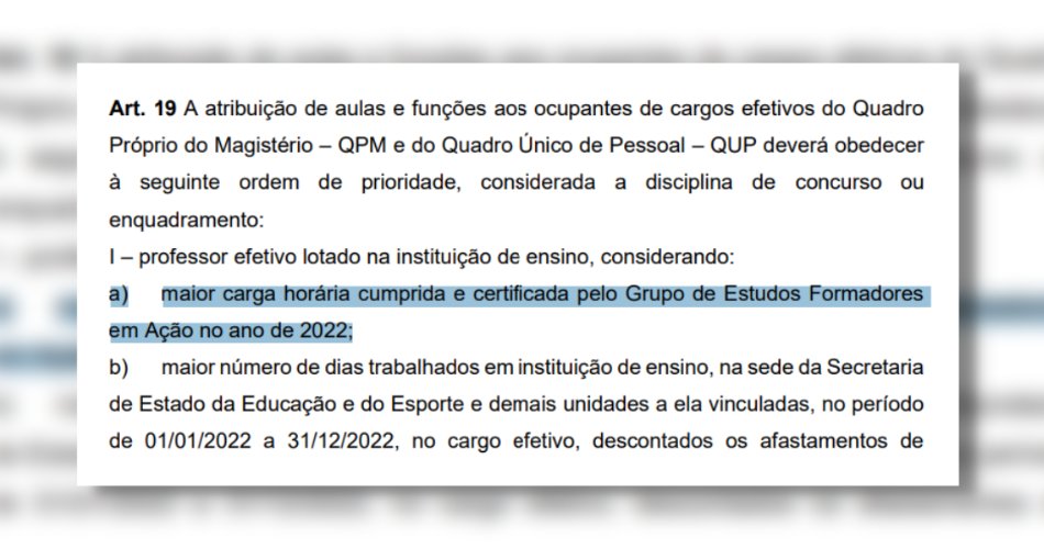 Mas o ponto crítico da resolução deste ano reside no Artigo 19, que privilegia, na classificação dos(as) QPMs, educadores(as) que cumpriram maior carga horária no Grupo de Estudo Formadores em Ação, programa elaborado e certificado pela própria Seed.
