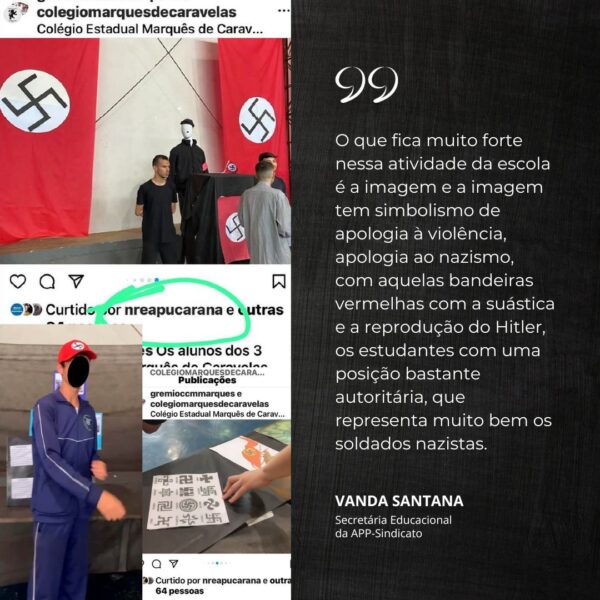 Segundo o órgão, a atividade com bandeiras enormes exibindo símbolos nazistas, alunos(as) usando bonés com a cruz suástica e até um boneco representando Hitler “não se trata de uma apologia a qualquer regime”. Para a APP-Sindicato, a resposta do NRE, além de não reconhecer o problema, é desastrosa, pois naturaliza esse tipo de iniciativa ilegal e abre portas para outras ocorrências semelhantes nas escolas.