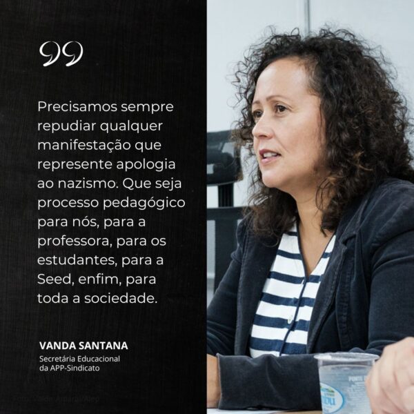 “Precisamos sempre repudiar qualquer manifestação que represente apologia ao nazismo. Que seja processo pedagógico para nós, para a professora, para os estudantes, para a Seed, enfim, para toda a sociedade”, afirma.