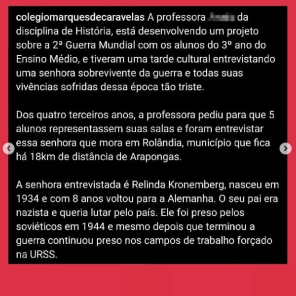 “O Colégio Estadual Marquês de Caravelas e o Grêmio Estudantil do Colégio Marquês de Caravelas, de Arapongas, postaram uma reportagem em seus perfis apresentando um trabalho sobre a Segunda Guerra Mundial. Ressaltamos que o trabalho desenvolvido não se trata de uma apologia a qualquer regime, mas sim uma tentativa de detalhar os horrores da Segunda Guerra Mundial para que tais eventos sombrios nunca mais se repitam.