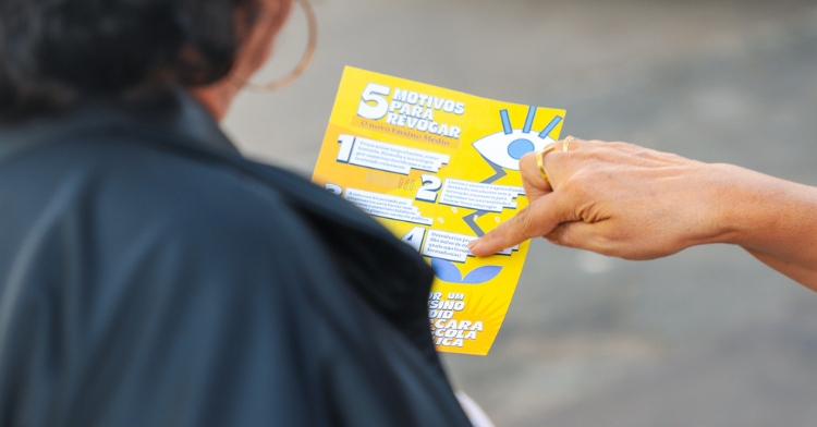 No interior, dirigentes estaduais também realizaram panfletagem nas escolas. Além disso, educadores(as) e estudantes se mobilizaram no intervalo das aulas para fazer fotos com cartazes e faixas pela revogação do Novo Ensino Médio.