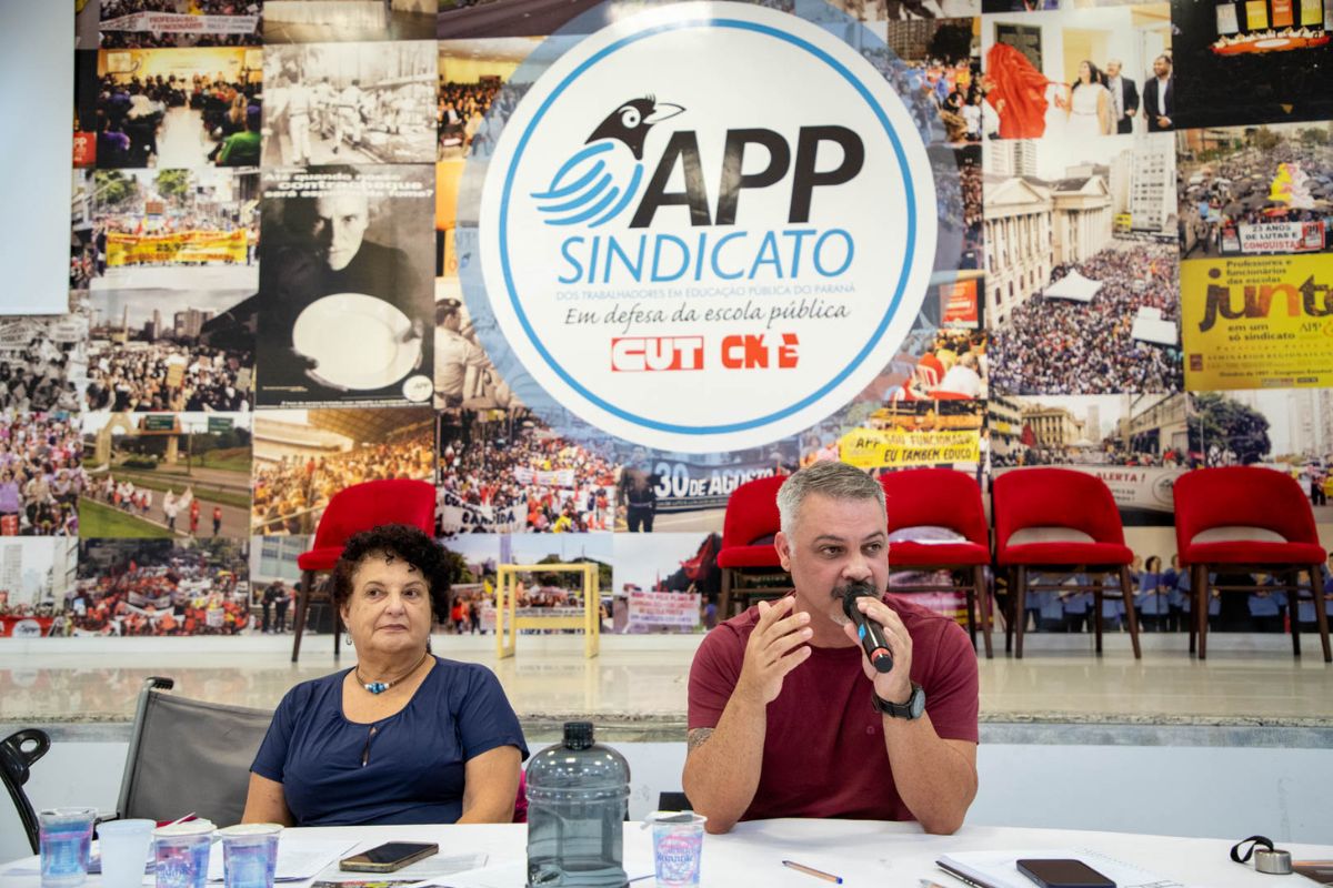 Maria Adelaide Mazza Correia, secretária estadual de Aposentados(as) da APP, e Cleiton Denez, secretário executivo de Formação Política Sindical e Cultura da APP – Foto: Luan Romero / APP-SindicatoA presidenta da APP, Walkiria Mazeto, deu boas vindas aos participantes do encontro, comentou as decisões políticas do governo Ratinho Júnior contra os(as) educadores(as) e destacou as ações que a direção do sindicato tem feito em defesa dos direitos dos(as) aposentados(as).
