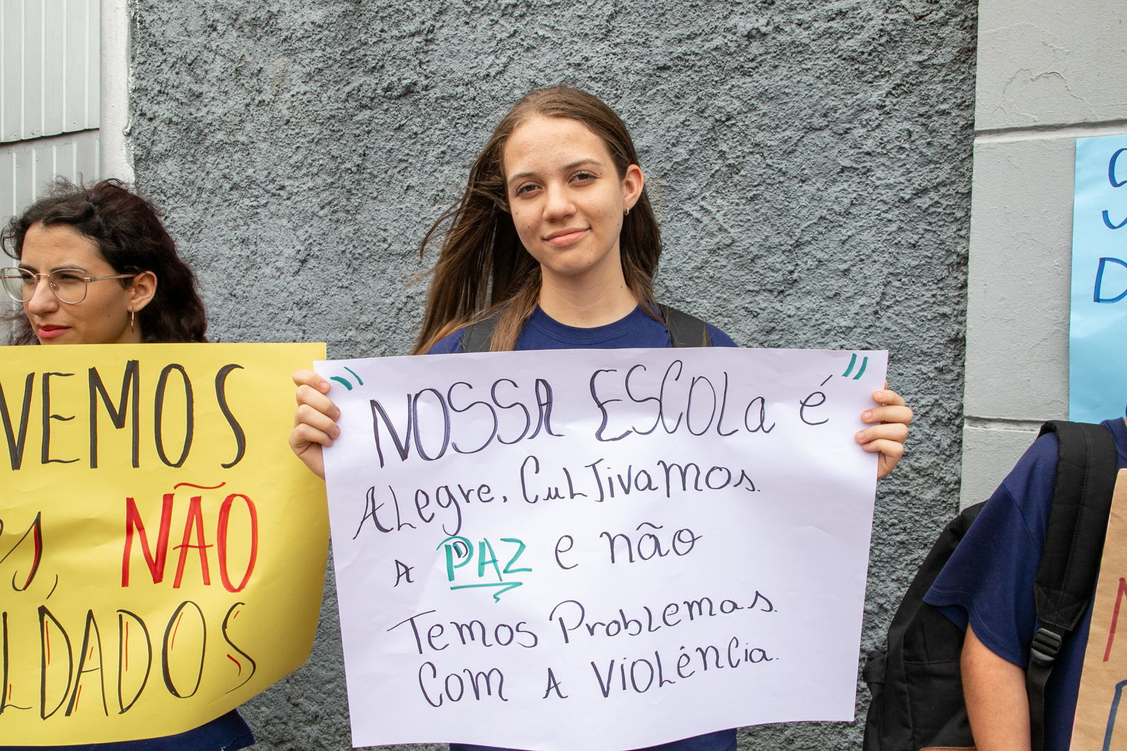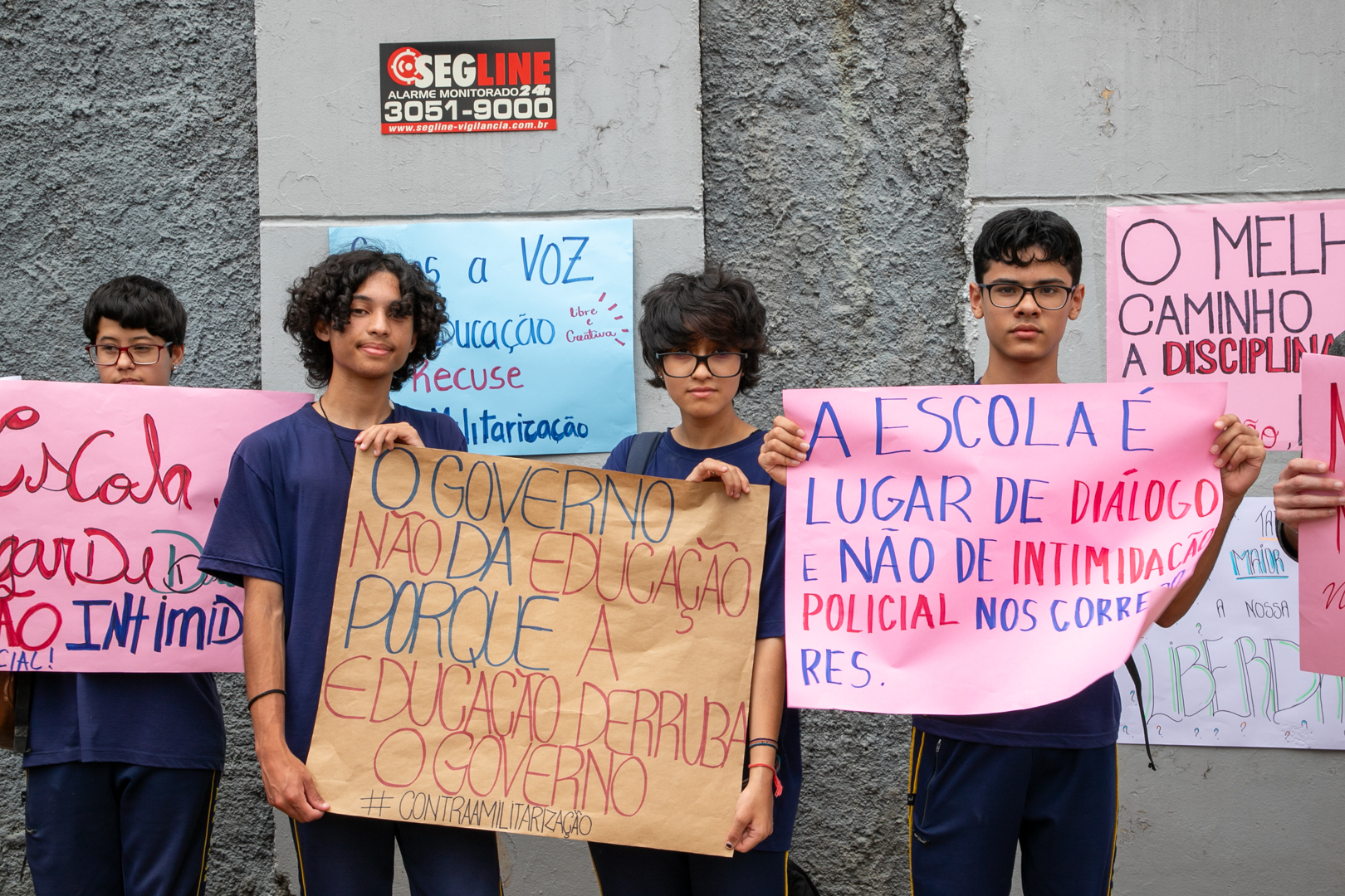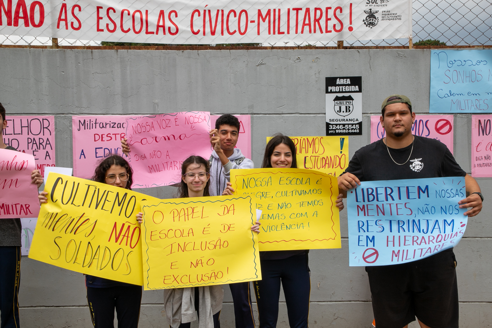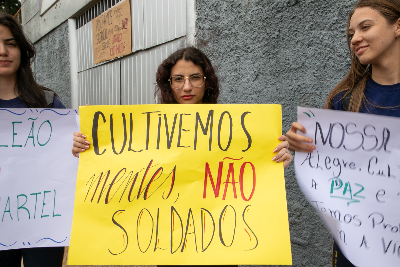 O grêmio estudantil fez uma enquete interna e 90% dos estudantes votaram contra a militarização. O colégio tem 940 alunos e não há problemas com violência.
