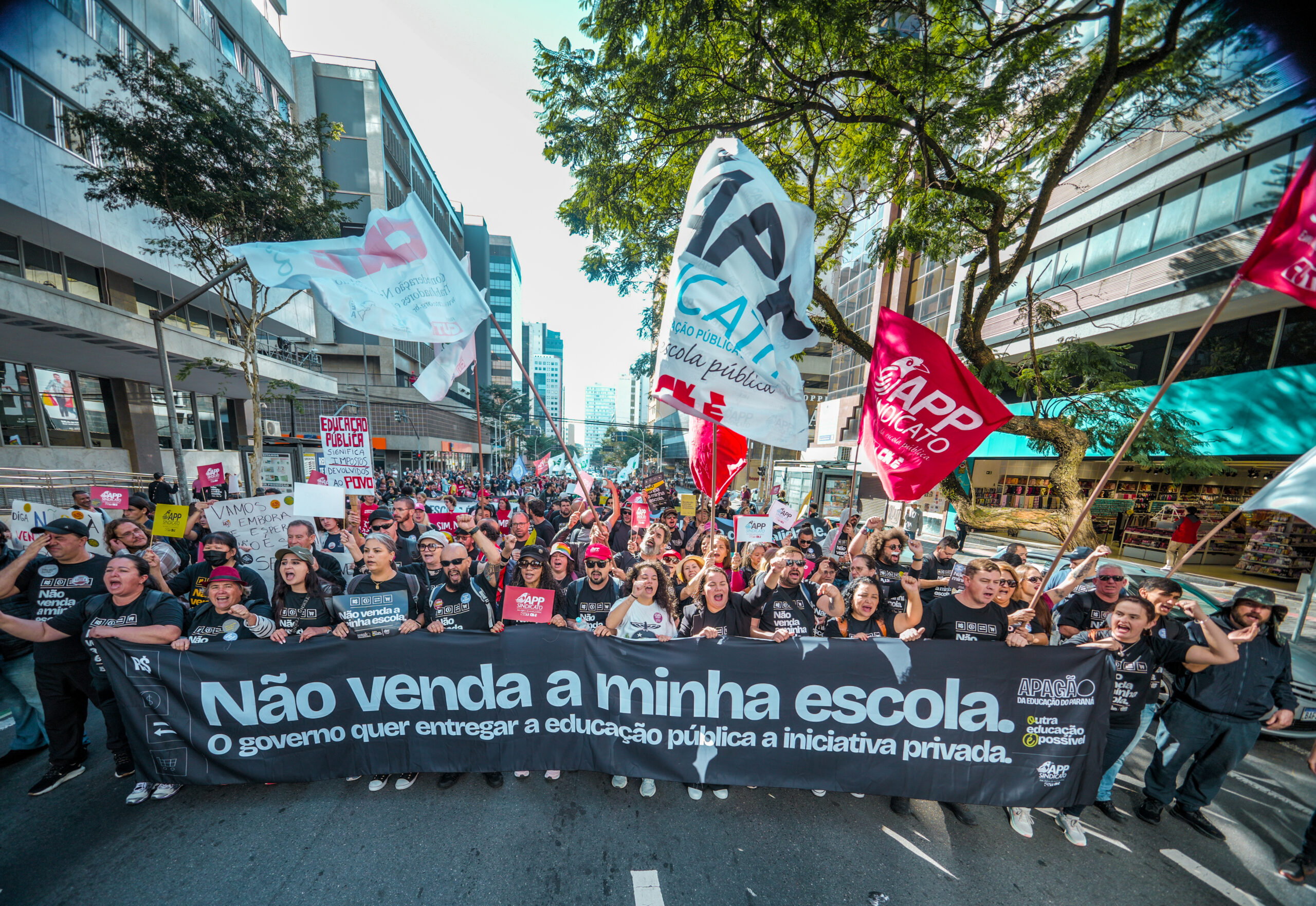 Em 2024, durante todo o ano, greve e atos da campanha Não Venda a Minha Escola mobilizaram a categoria e a sociedade contra o programa “Parceiro da Escola”, projeto do governador Ratinho Jr. de privatização da gestão das escolas públicas.
