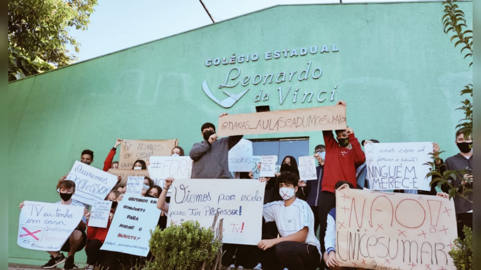 Na terça-feira (22) foi a vez dos alunos(as) do Colégio Leonardo da Vinci protestarem. Com o novo modelo implantado pela Secretaria da Educação, nas terças-feiras eles são obrigados a assistir seis aulas consecutivas pela TV, com o apoio apenas de um monitor, embora o colégio tenha professores(as) capacitados(as) para dar essas aulas presencialmente.