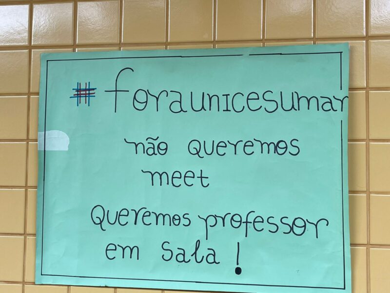 O sindicato aponta os inúmeros problemas do modelo. Entre eles, a presença em sala de aula de apenas uma televisão e um(a) monitor(a) com formação de Ensino Médio. A função deles é apenas ligar o aparelho de TV e encaminhar dúvidas dos(as) alunos(as).
