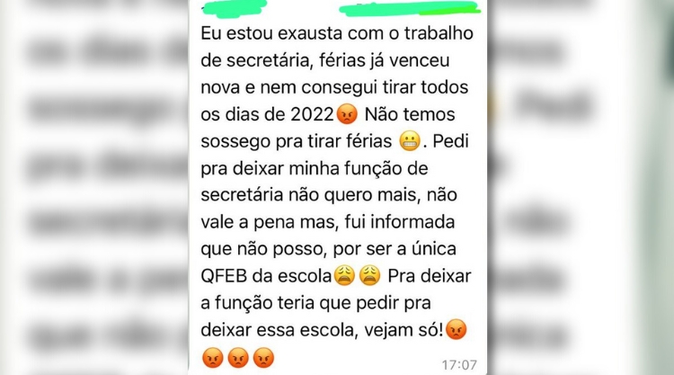 “É muito sério tudo isso, sabemos também que, no desespero, o(a) diretor(a) em vez de cobrar da Seed, acaba sobrecarregando os(as) funcionários(as). Esquece que quem vai responder por tudo isso é ele mesmo, o gestor da escola”, completa a secretária.