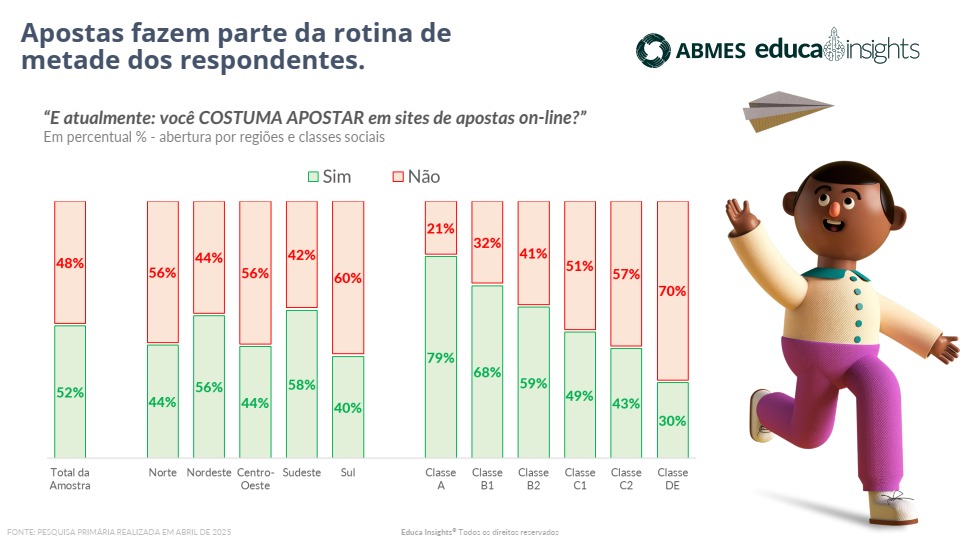 Realizada pela Associação Brasileira de Mantenedoras do Ensino Superior (Abmes) em parceria com o instituto Educa Insights, a pesquisa ouviu 11.762 pessoas, entre os dias 20 e 24 de março, para obter 2.317 respostas completas. Os(as) jovens entrevistados(as), com faixa etária entre 18 e 35 anos, são das cinco regiões do país e de todas as classes sociais. Os dados demonstram que os(as) apostadores(as) se concentram nas classes B (37%) e C (37%), sendo 85% homens trabalhadores com salário proveniente de emprego formal como principal fonte de renda.