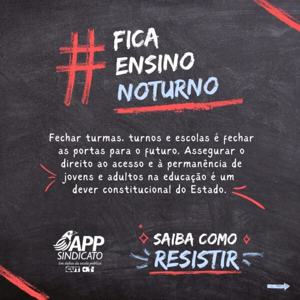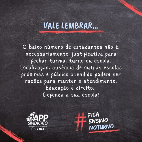 A APP-Sindicato também tem recebido relatos sobre o encerramento de turmas do ensino noturno, fato que pode atingir os(as) estudantes que mais precisam da escola pública; aqueles(as) que trabalham durante o dia e não têm condições de frequentar outro turno.