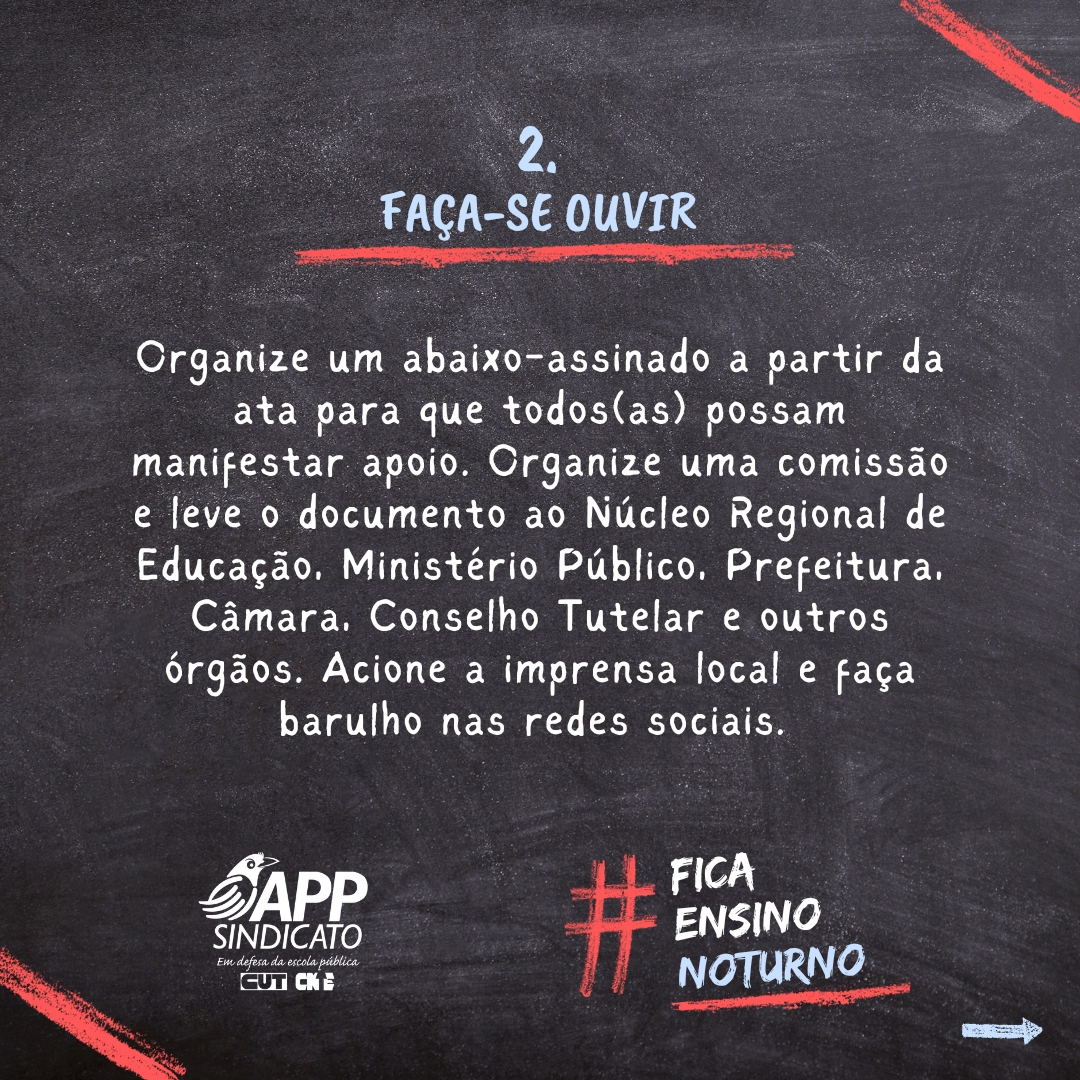 Convoque toda a comunidade escolar, o grêmio estudantil e, se possível, lideranças e políticos(as) locais para uma reunião. Debata os prejuízos do fechamento e faça uma ata com a decisão da comunidade. Utilize dados e informações que justifiquem a permanência do período noturno. Colete a assinatura de todos(as) os presentes.