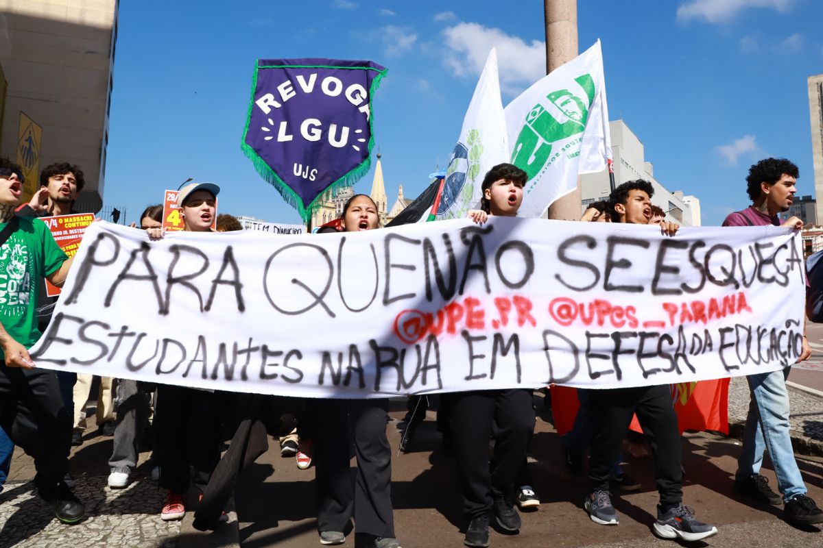 Presidenta da União Paranaense dos Estudantes (Upes), Vitória Carvalho Bonfim afirma que ainda hoje os(as) estudantes enfrentam muitas dificuldades nas escolas públicas e que a participação na luta dos(as) educadores(as) é uma forma de também colocar as pautas dos(as) estudantes.