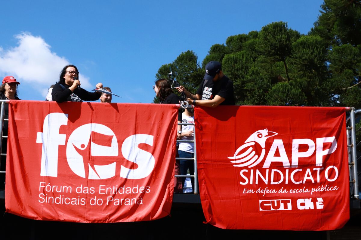 Antes de chegar no Palácio Iguaçu, onde fica o gabinete do governador Ratinho Júnior (PSD), a passeata fez duas paradas. Na primeira, em frente à Federação das Indústrias do Estado do Paraná (FIEP), foram apresentadas pautas nacionais dos(as) trabalhadores(as), como a o fim da escala 6×1, contra os juros altos, defesa da taxação dos super-ricos e da isenção do imposto de renda para quem recebe até cinco salários mínimos.