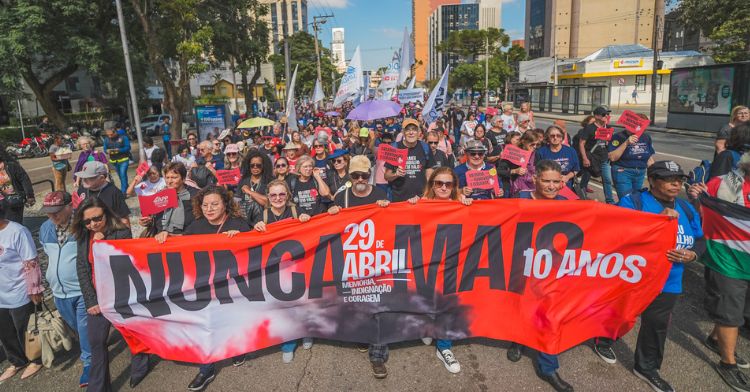“Neste dia que marca dez anos daquela violência do Estado, retornamos às ruas para denunciar que os ataques continuam, mas também para mostrar ao governo que seguimos fazendo a resistência e que o nosso trabalho tem valor. Nós atendemos a população paranaense e, além de valorização, a nossa luta é pela oferta de uma educação pública de qualidade para todos e todas e melhores condições de trabalho na saúde, nas universidades, na segurança pública, em todas as áreas do Estado”, disse a presidenta da APP-Sindicato, Walkiria Mazeto.