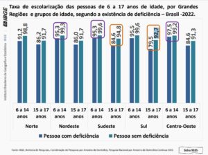 Entre os(as) PCDs de 15 a 17 anos, faixa correspondente ao público da rede estadual de educação, a região Sul tem os piores índices, com uma taxa de escolarização de apenas 79,5%, ante 92,7% das pessoas sem deficiência com a mesma idade.