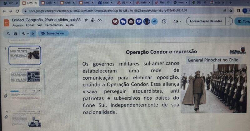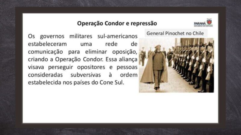 A imagem do slide circulou em grupos de mensagem no início deste mês de agosto. O conteúdo aborda a Operação Condor, um plano executado por regimes ditatoriais da América do Sul nas décadas de 70 e 80, com apoio dos EUA, para perseguir e matar quem não concordava com a ditadura.