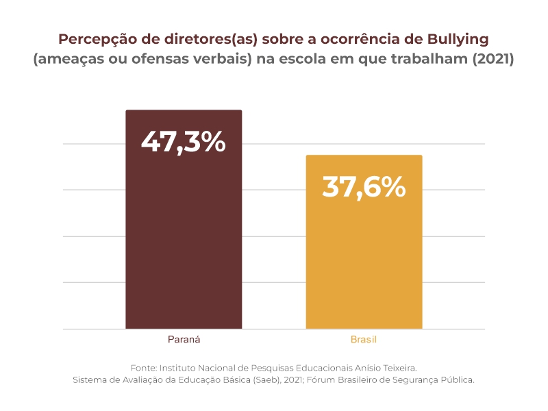 Dados do 17º Anuário Brasileiro de Segurança Pública, divulgado na manhã desta quinta-feira (20) pelo Fórum Brasileiro de Segurança Pública, mostram que a percepção de violência por professores(as) e diretores(as) registra níveis alarmantes. No Paraná, o percentual de escolas com registros de bullying, ameaças ou ofensas verbais em 2021 foi de 47,3%. O índice ficou 10% acima da média nacional.