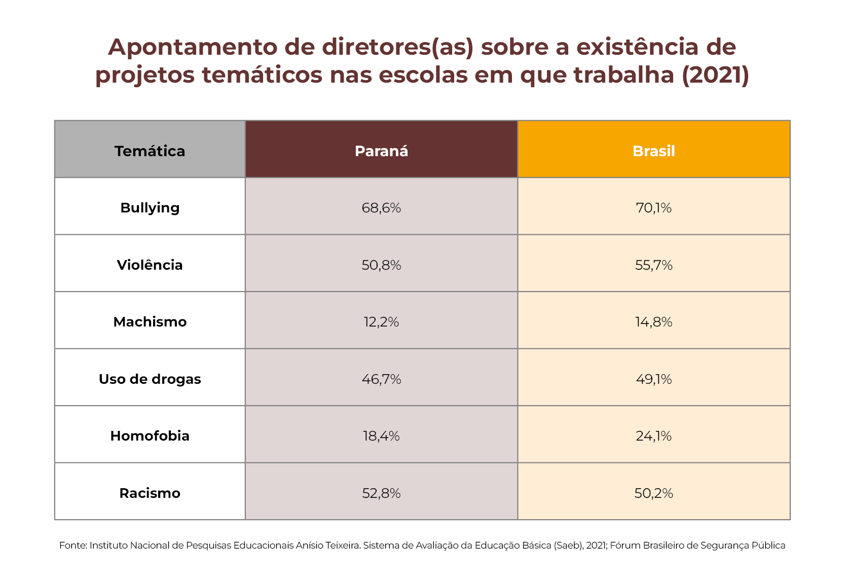 O levantamento também revela informações sobre a existência de projetos para o enfrentamento de várias formas de violência e discriminação. Comparado com o total de estabelecimentos de ensino do país, os índices das escolas do Paraná ficaram abaixo da média em cinco dos seis temas pesquisados. As ações de prevenção e enfrentamento ao bullying, por exemplo, foram apontadas por 68,6% dos(as) diretores(as), ante 70,1% da média nacional.