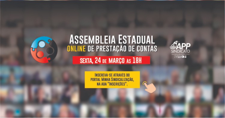 A APP-Sindicato convoca os(as) trabalhadores(as) da educação para a Assembleia Estadual de prestação de contas que será realizada no próximo dia 24 de março (Sexta-feira). A reunião será realizada online, via Zoom, com primeira chamada às 18h e a segunda chamada às 18h30.