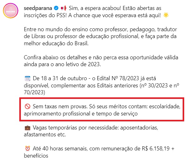 Em publicação comunicando a abertura das inscrições, as redes sociais da Secretaria da Educação propagandearam a ausência de taxas e provas.