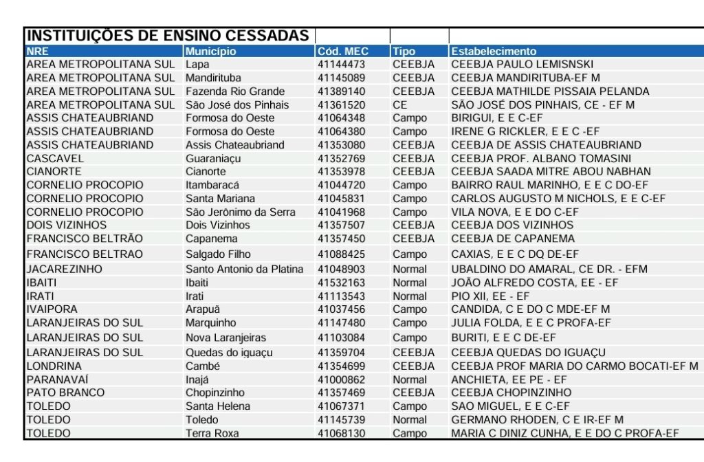 As instituições de ensino mencionadas estão localizadas em 27 municípios diferentes. No Núcleo Regional de Educação (NRE) Área Metropolitana Sul, o mais atingido, quatro Ceebjas aparecem na lista. Nos NREs de Assis Chateubriand, Cornélio Procópio, Laranjeiras do Sul e Toledo, o fechamento deve atingir três escolas em cada regional.