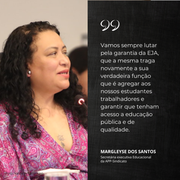 Margleyse lembra que desde 2019 a APP e o Fórum Paranaense de Educação de Jovens e Adultos têm realizado mobilizações alertando e denunciando que essas alterações não dariam certo, pois uma das grandes características da EJA é justamente dar condições de entrada e permanência ao trabalhador.