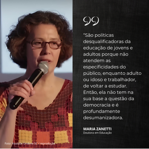 “São políticas desqualificadoras da educação de jovens e adultos porque não atendem as especificidades do público, enquanto adulto ou idoso e trabalhador, de voltar a estudar. Então, ela não tem na sua base a questão da democracia e é profundamente desumanizadora”, critica.