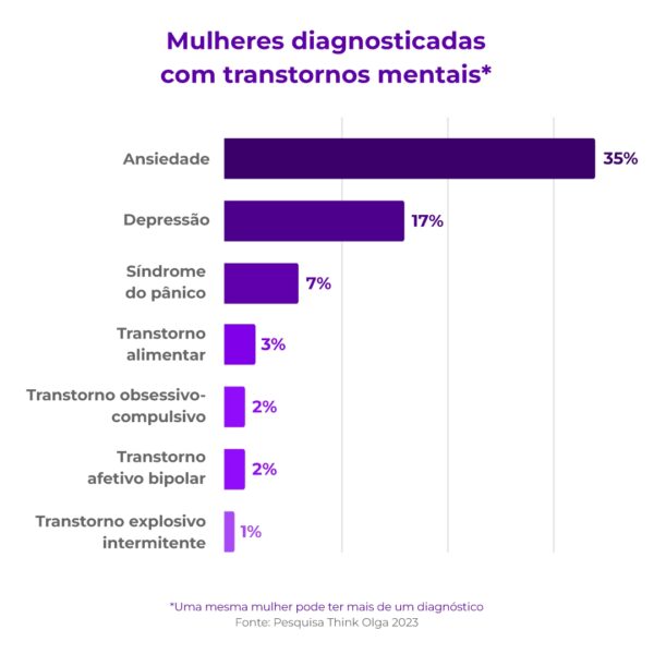 De acordo com o levantamento, quase metade das mulheres (45%) relataram diagnóstico de ansiedade, depressão ou algum outro transtorno mental. Estresse, irritabilidade, sonolência, fadiga, baixa autoestima, insônia e tristeza são os sintomas que se apresentam de maneira mais comum no cotidiano delas.