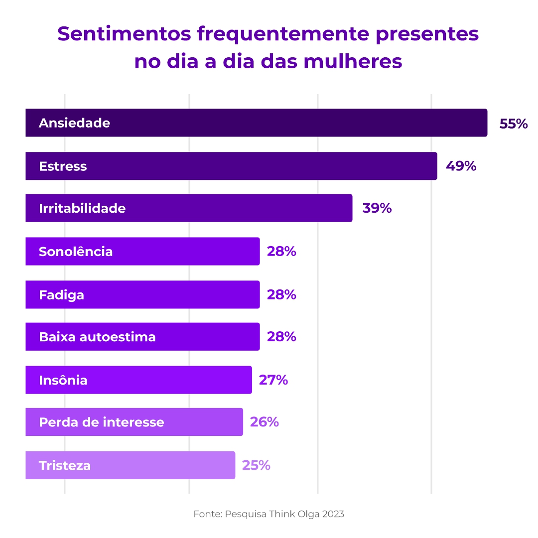 De acordo com o levantamento, quase metade das mulheres (45%) relataram diagnóstico de ansiedade, depressão ou algum outro transtorno mental. Estresse, irritabilidade, sonolência, fadiga, baixa autoestima, insônia e tristeza são os sintomas que se apresentam de maneira mais comum no cotidiano delas.