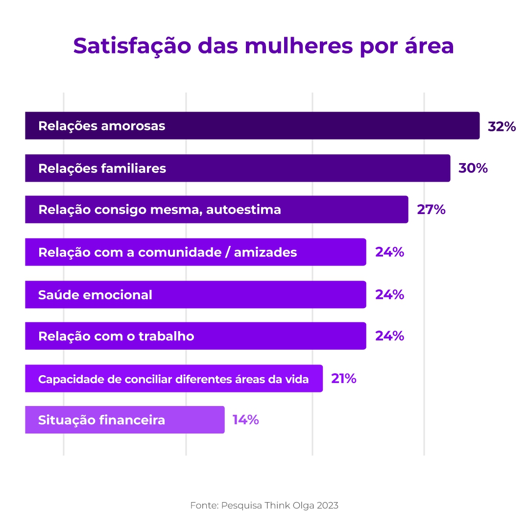 O descontentamento maior é com as relações amorosas (32%), seguido de relações familiares (30%), relação consigo mesma, autoestima (27%), relação com a comunidade/amizades (24%), saúde emocional (24%), relação com o trabalho (24%), capacidade de conciliar diferentes áreas da vida (21%) e situação financeira (14%).