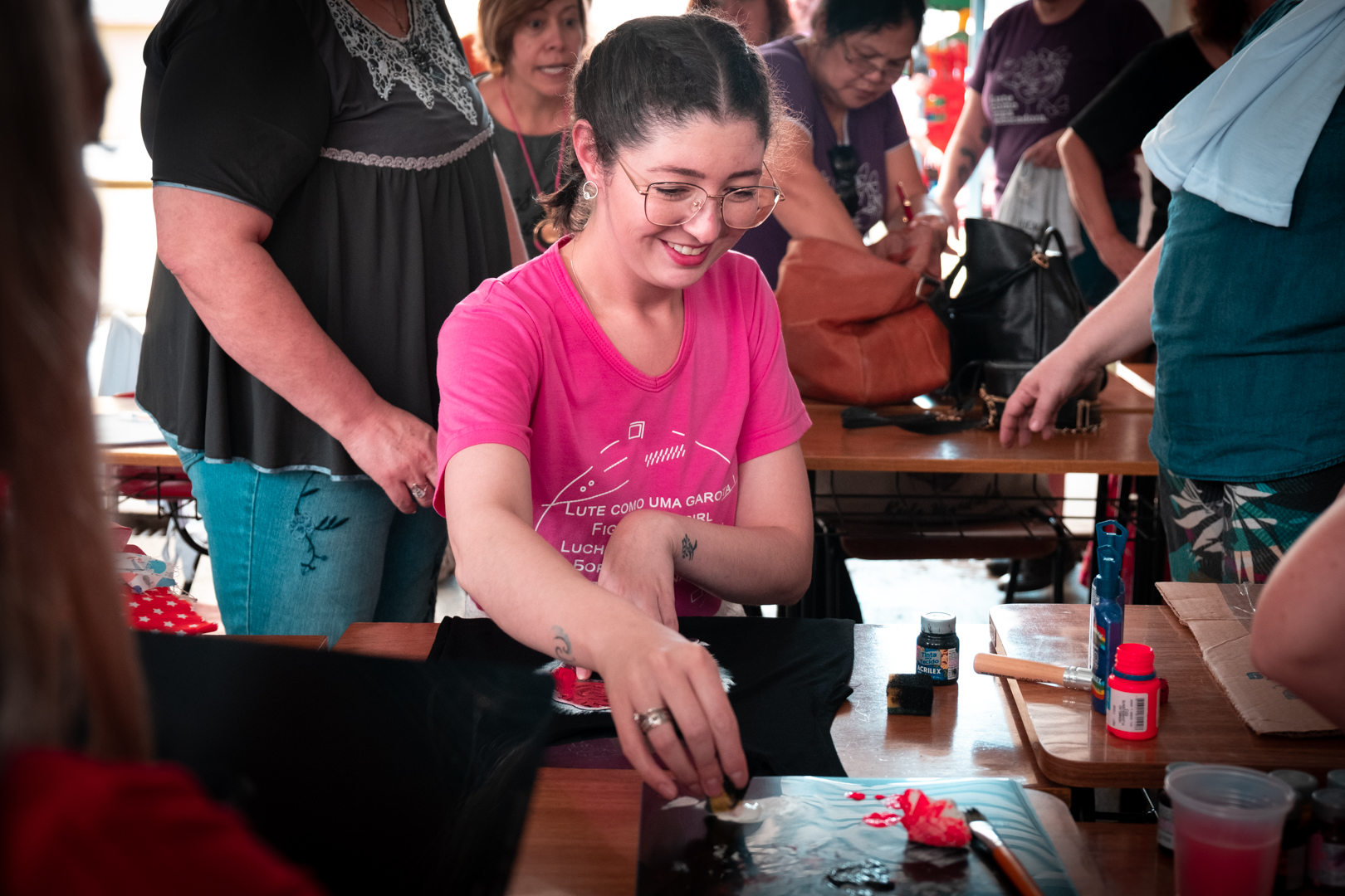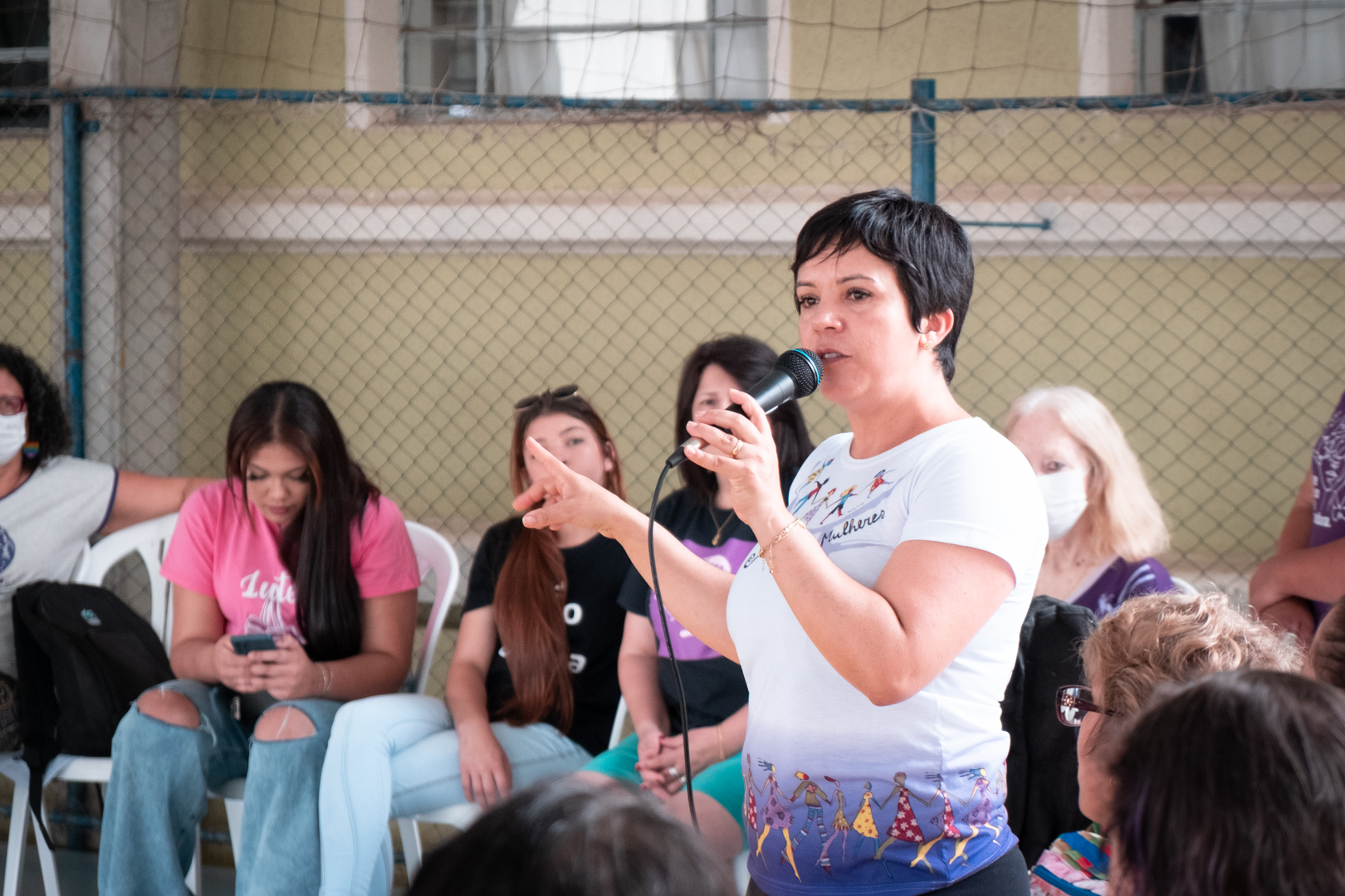 Pela manhã, as atividades envolveram acolhida na escola José Durski, com oficina de stêncil e Batuque feminista, e uma roda de conversa voltada a debater e formular ações concretas para a superação de toda forma de violência contra a mulher, da prevenção às medidas judiciais.
