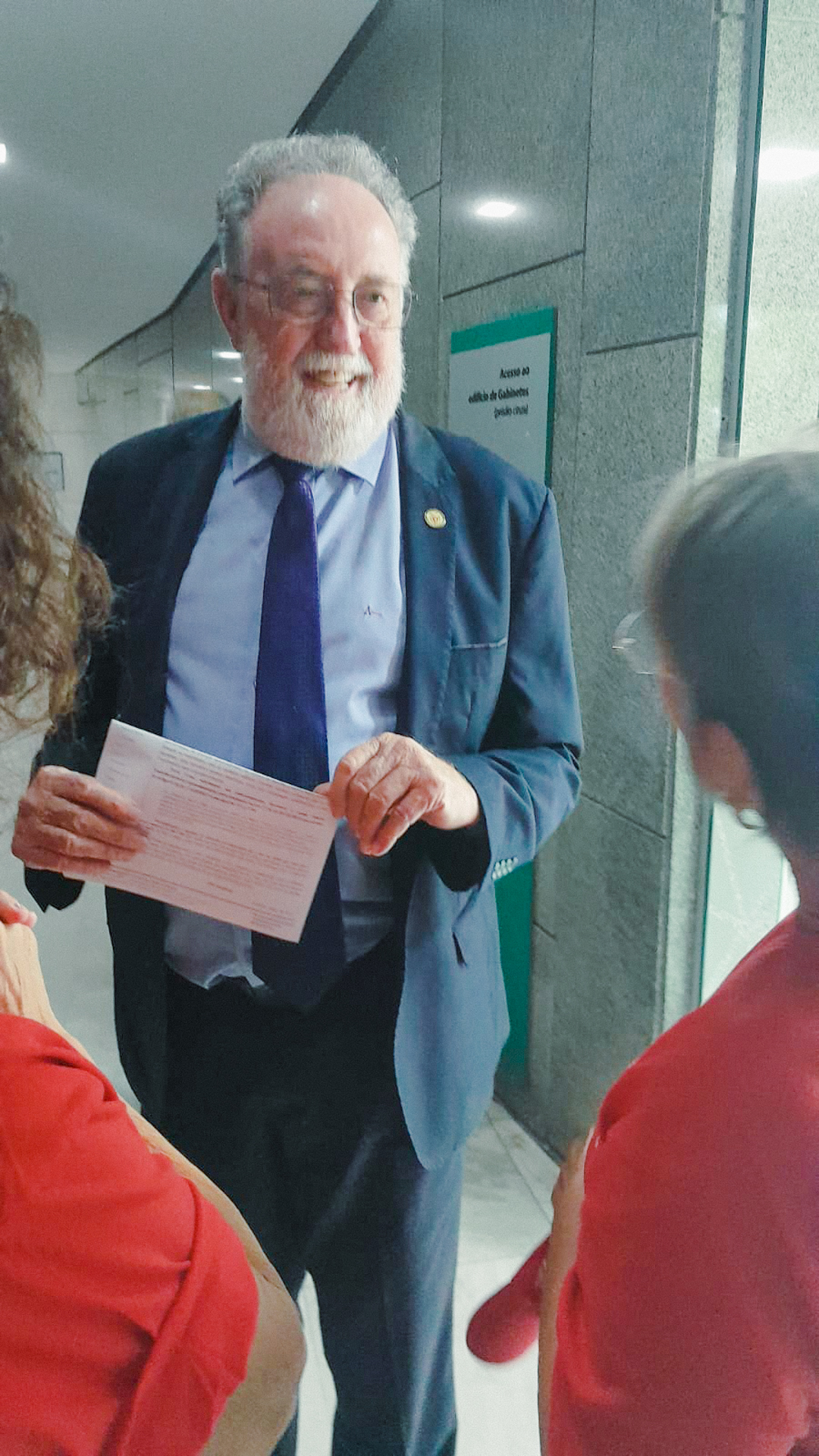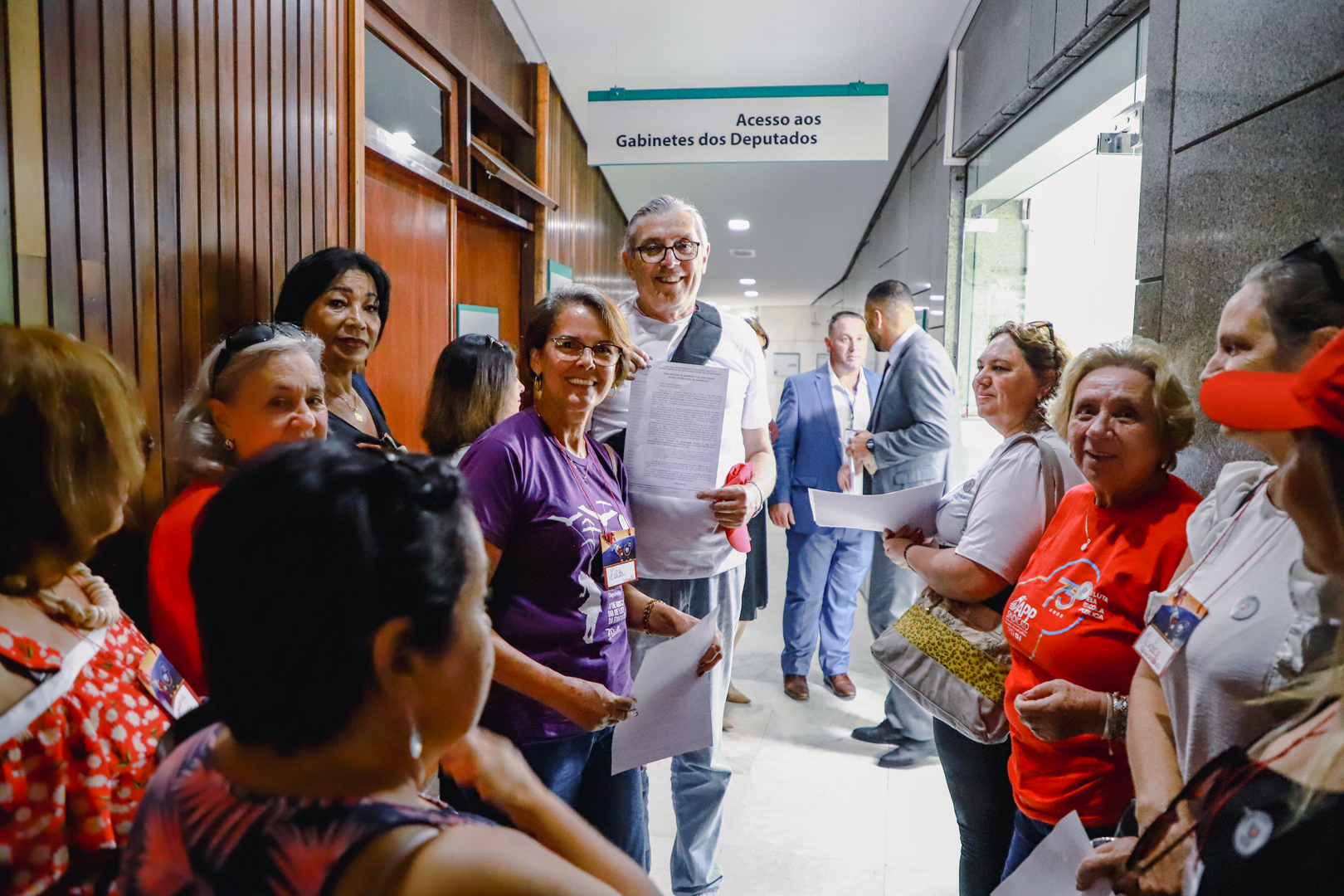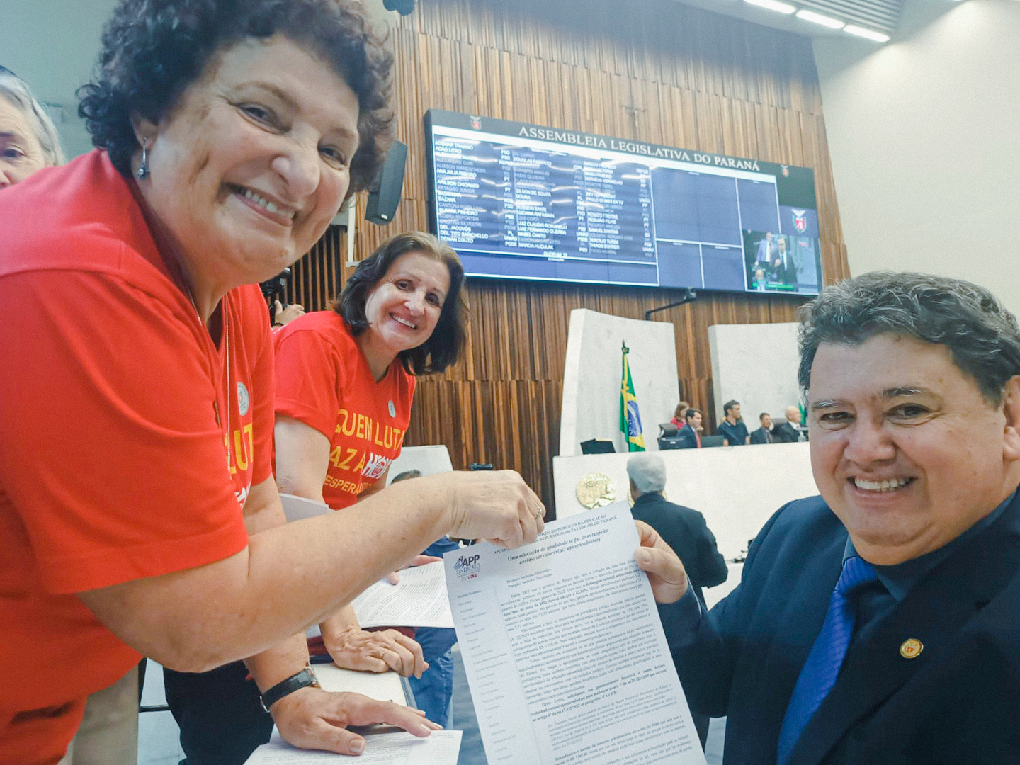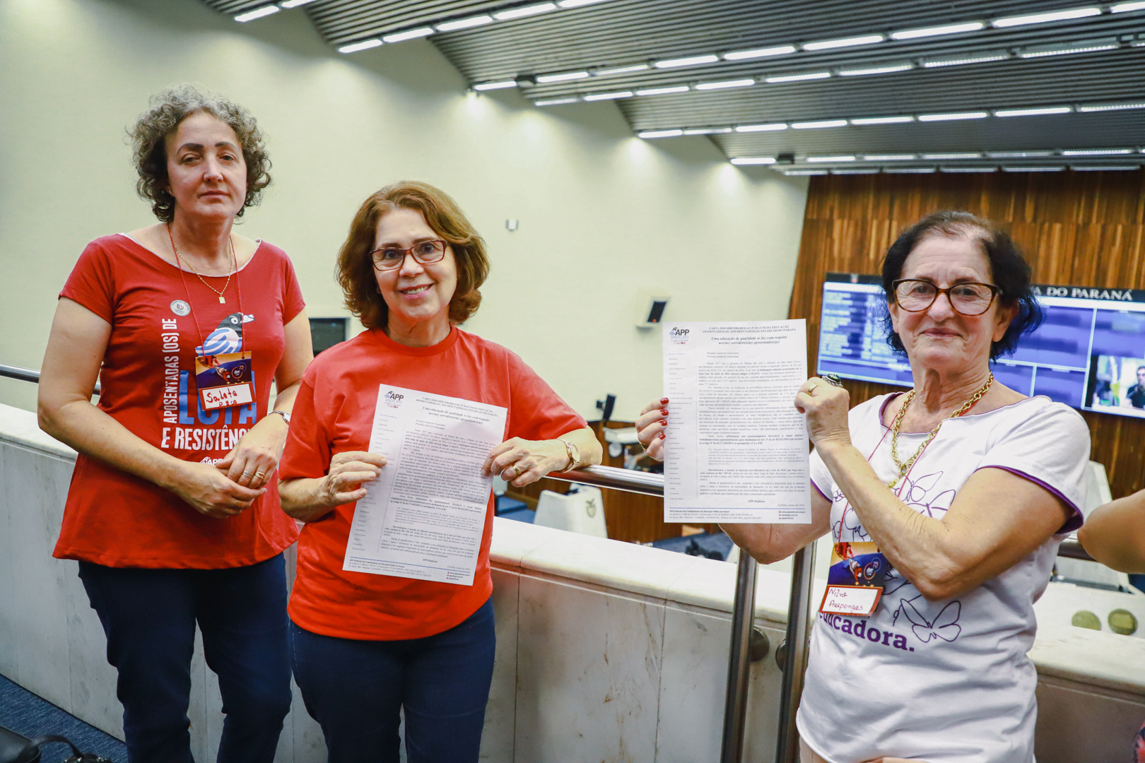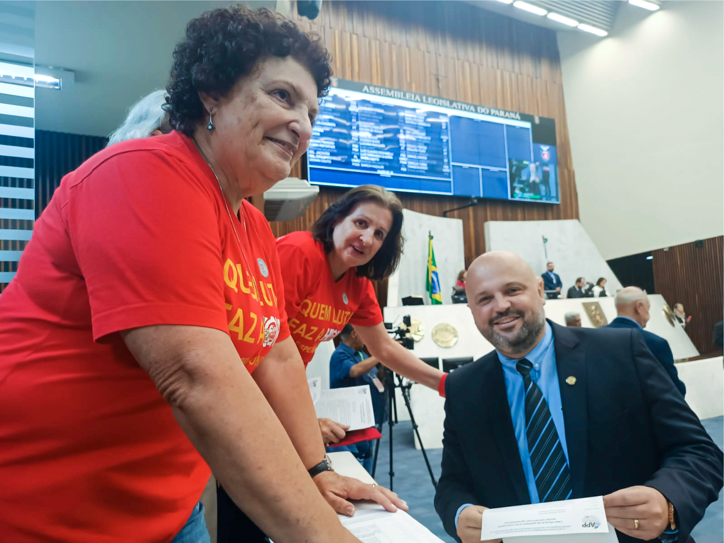 Integrantes do Coletivo de Aposentados da APP começaram a tarde desta terça-feira (21) com uma visita à Assembleia Legislativa, onde entregaram a parlamentares uma carta em que reivindicam a isenção de desconto previdenciário até o teto do INSS (R$ 7.507,49) e o pagamento da Data-Base.