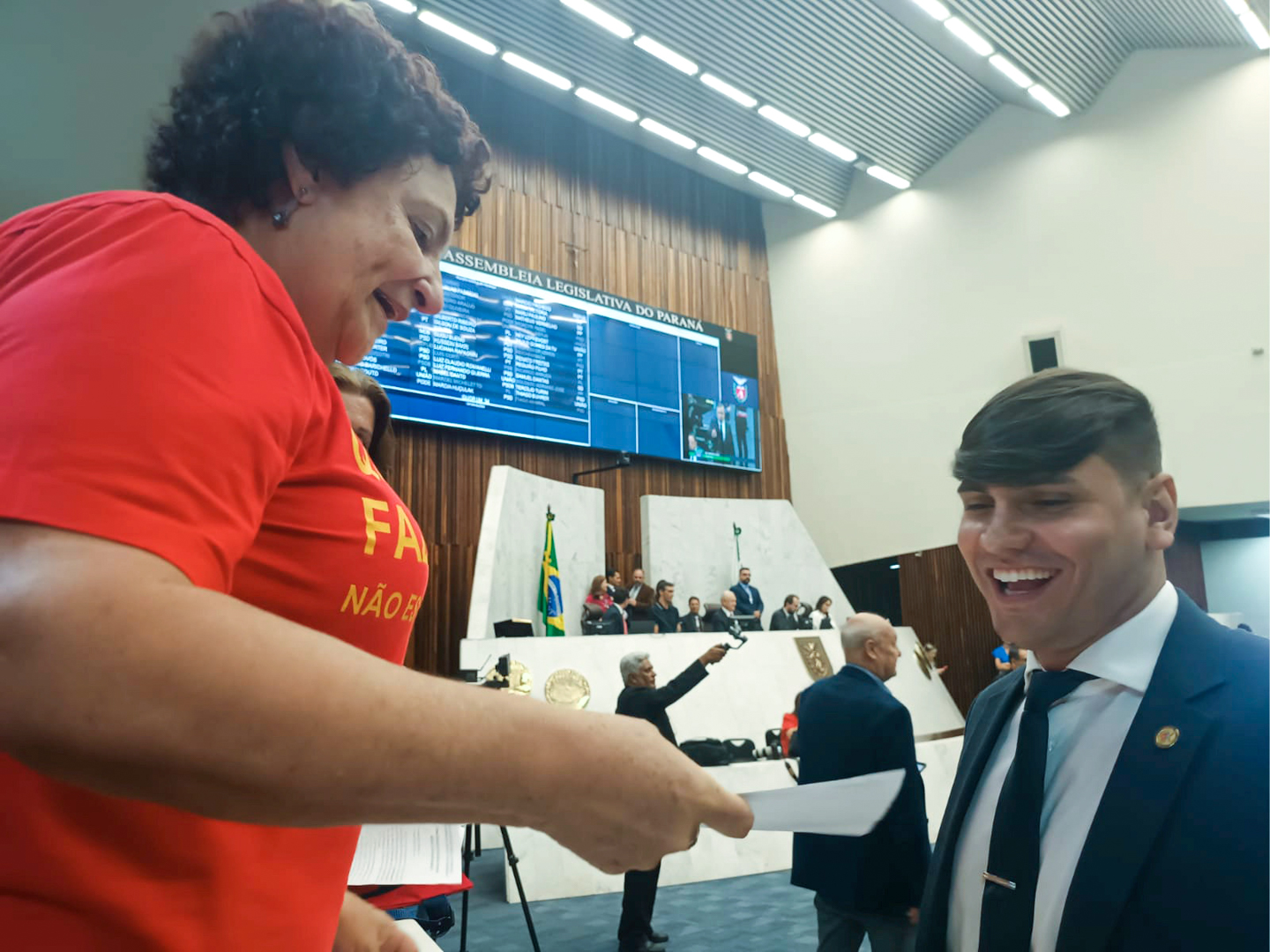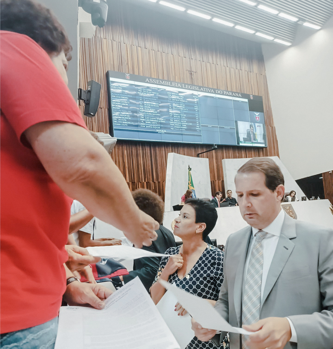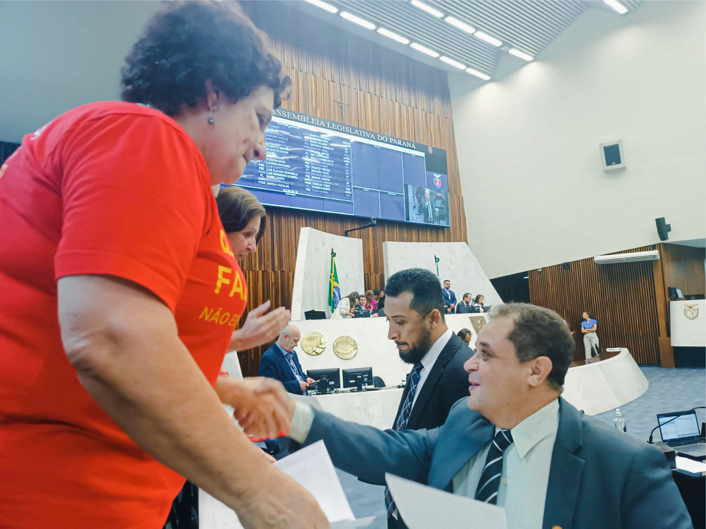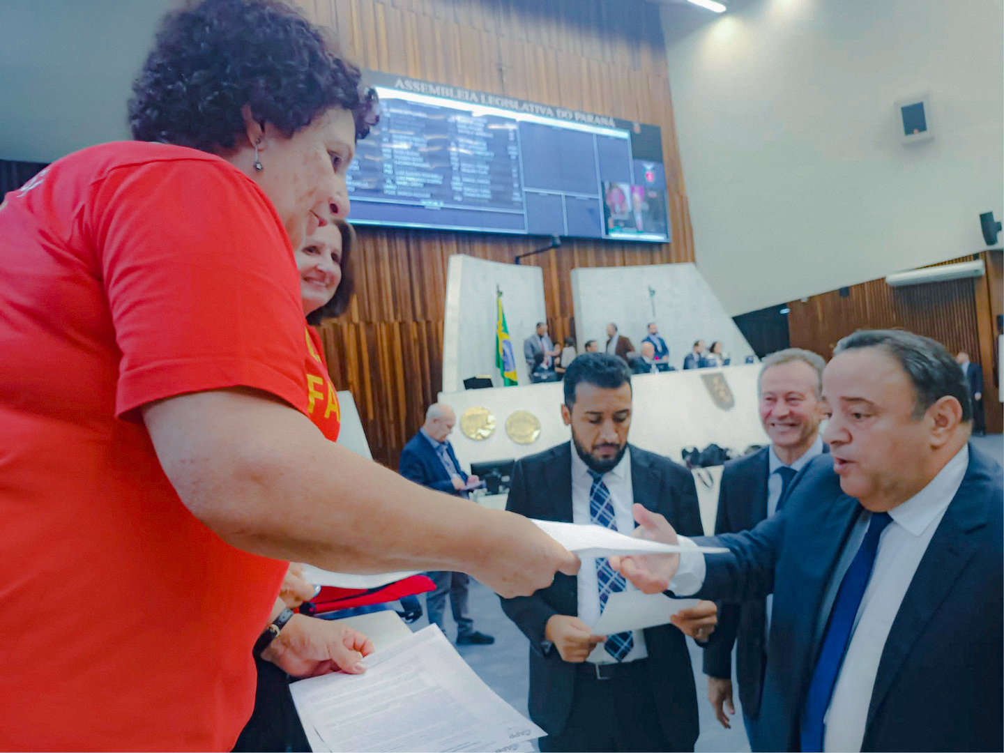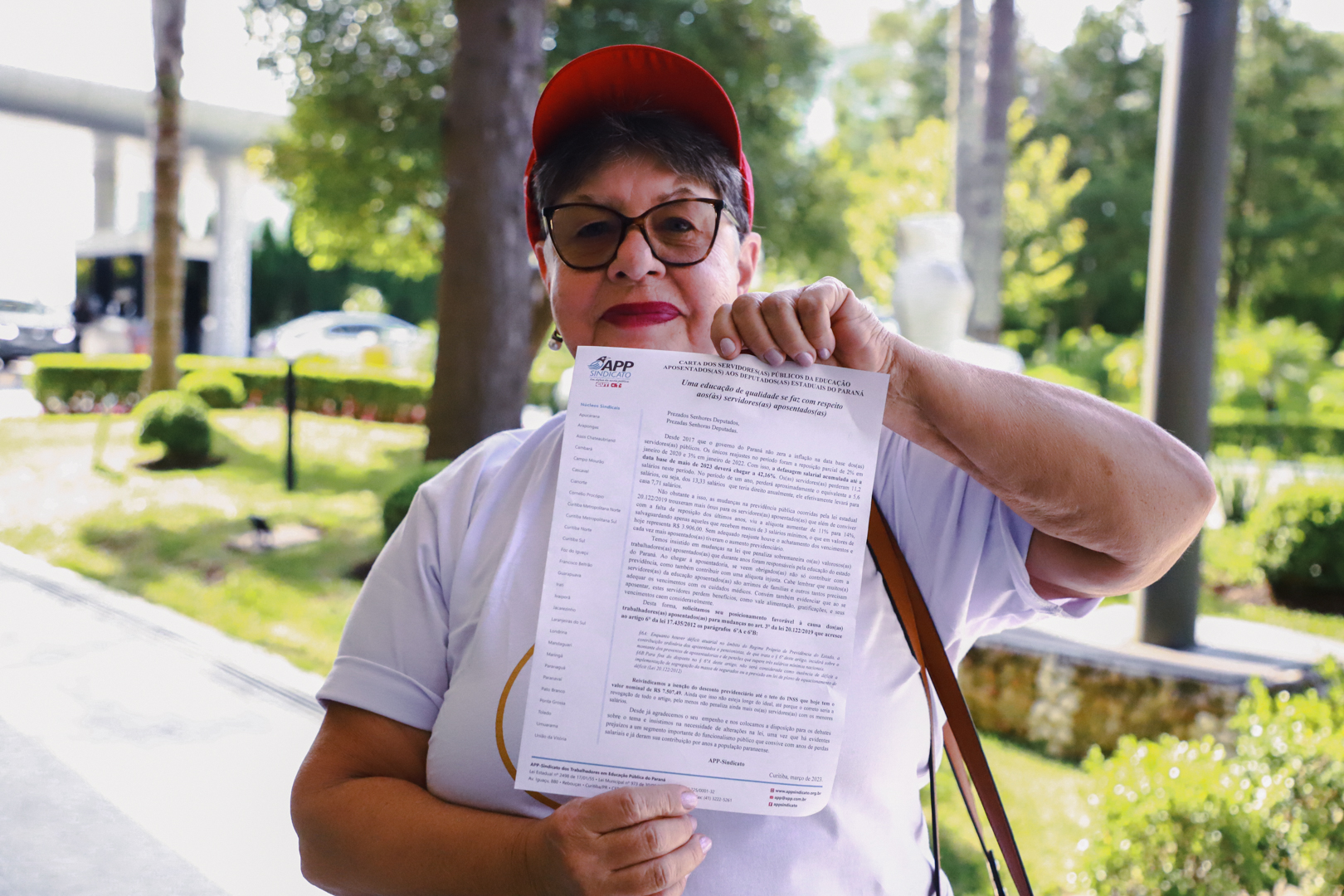 “Nós estivemos com todos(as) os(as) secretários(as) de aposentados(as) na Alep para entregar uma carta explicando sobre a necessidade da revogação do desconto previdenciário. O modelo como está agora tem gerado grandes prejuízos aos(às) aposentados(as). Hoje conseguimos entregar a carta para praticamente todos(as) os(as) deputados(as)”, explica a secretária de Aposentados(as) da APP, Maria Adelaide Mazza.