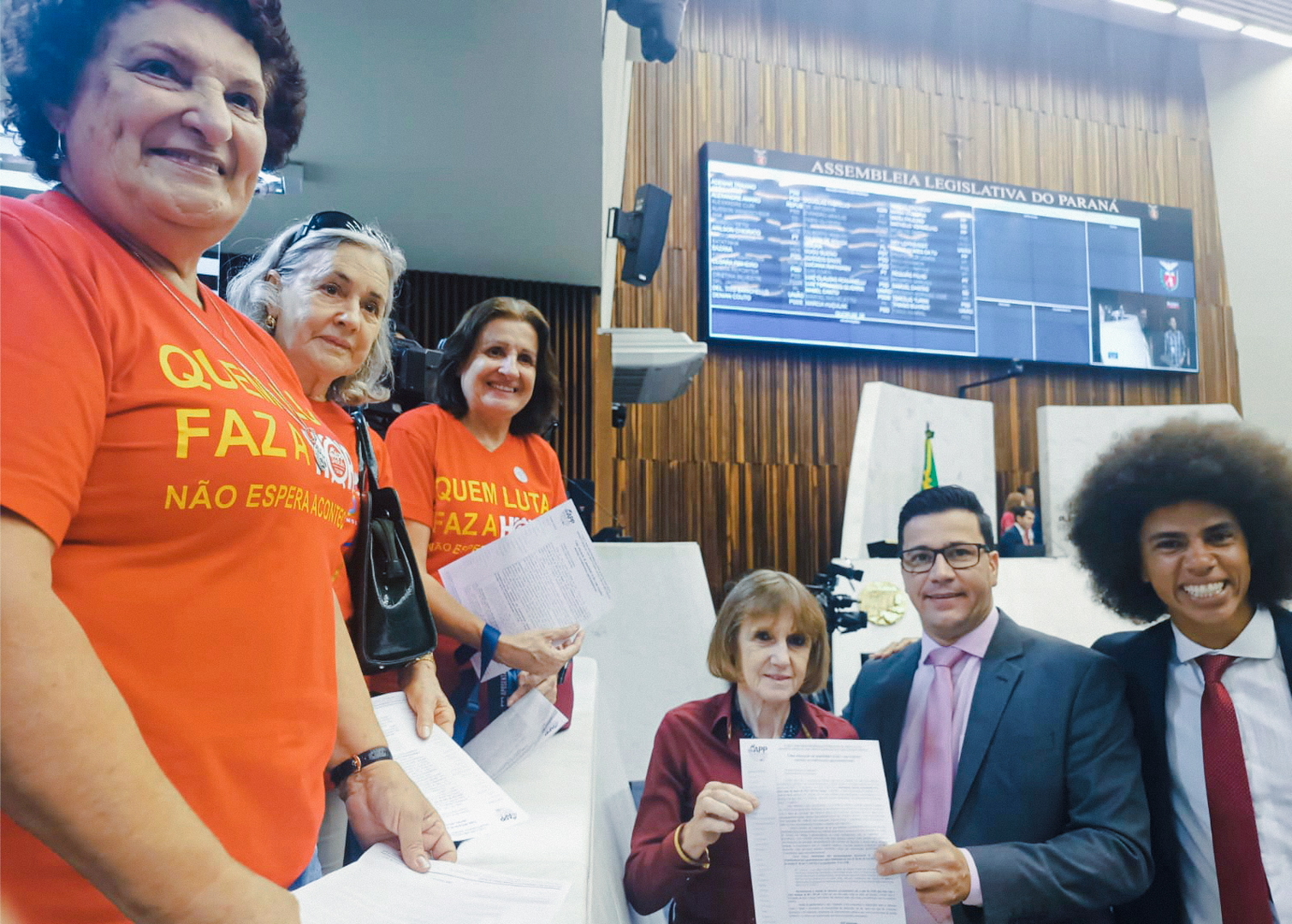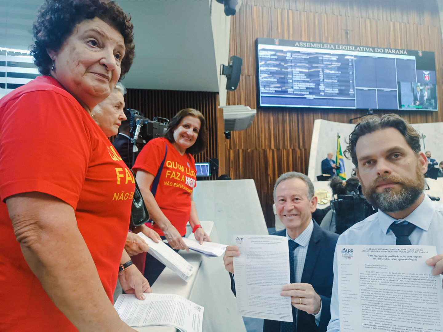 Integrantes do Coletivo de Aposentados da APP começaram a tarde desta terça-feira (21) com uma visita à Assembleia Legislativa, onde entregaram a parlamentares uma carta em que reivindicam a isenção de desconto previdenciário até o teto do INSS (R$ 7.507,49) e o pagamento da Data-Base.