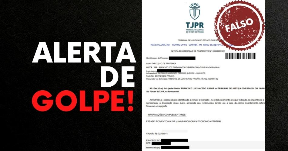 Estelionatários falsificam documentos do Tribunal de Justiça do Paraná, utilizam dados pessoais do(a) sindicalizado(a) e números reais de processos em andamento, nomes e fotos de advogados(as) que atuam no jurídico da APP e de desembargadores(as).