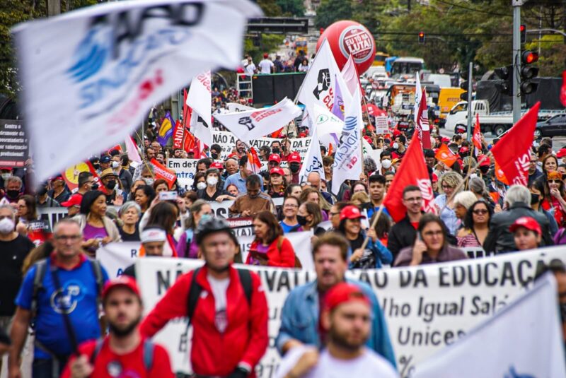 “Nós estamos na rua por melhores condições de trabalho, por salário justo e também por democracia. Democracia é quando os governantes eleitos pelo povo governam para o povo e não para atender aos interesses dos empresários que financiam e lucram com campanhas”, afirma Clau Lopes, secretário Executivo da Mulher Trabalhadora e dos Direitos LGBTI+ da APP.