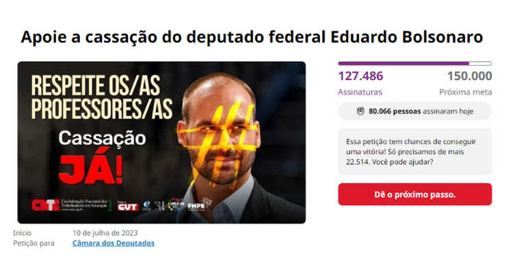 O abaixo-assinado que cobra a cassação do deputado federal Eduardo Bolsonaro (PL-SP) já passou a marca de 120 mil assinaturas desde as primeiras horas que foi iniciado. A ação é uma iniciativa da Confederação Nacional dos(as) Trabalhadores(as) em Educação (CNTE), após o deputado de extrema-direita comparar professores(as) a traficantes de drogas.