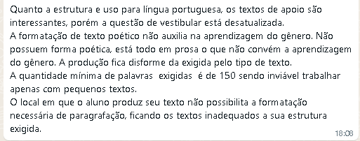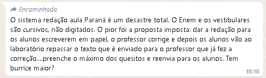 Educadores(as) também criticam os fundamentos pedagógicos da plataforma. Sob o atual governo, a substituição de resultados reais por índices padronizados tornou-se rotina, mas professores(as) questionam, por exemplo, a utilidade do sistema digital para estudantes que farão o Enem, como explicita comentário abaixo, recebido pelo Sindicato via Whatsapp.