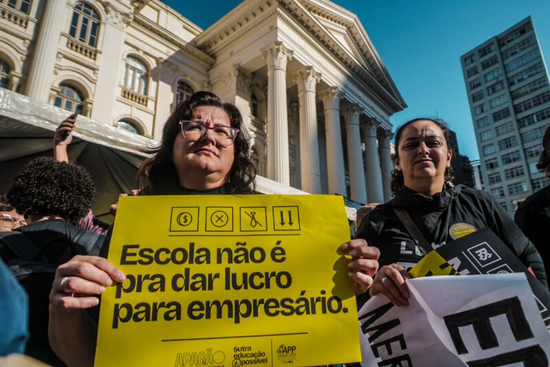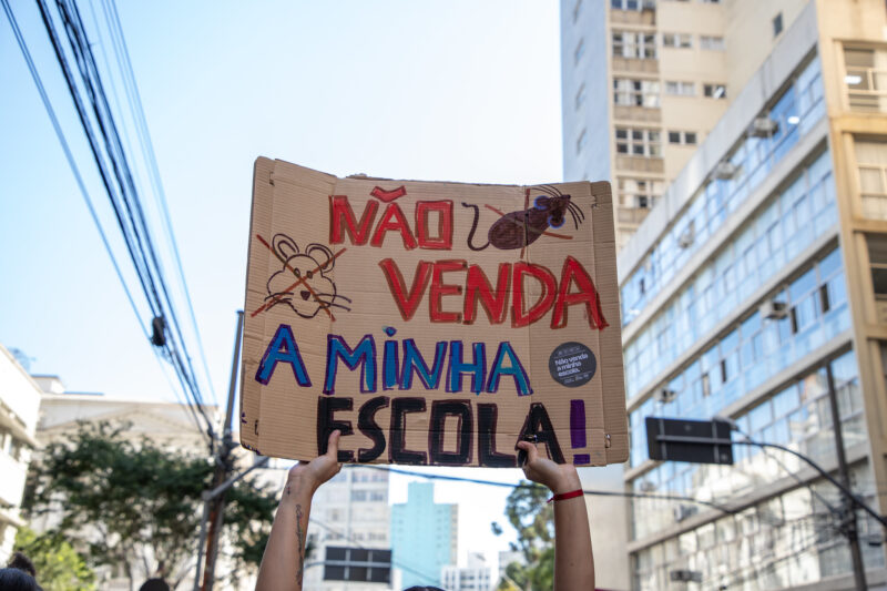 O processo de privatização coloca em risco os direitos sociais, a autonomia dos(as) educadores(as) e também dos(as) estudantes. Em São Paulo, o governo de Tarcísio de Freitas (Republicanos) concedeu à iniciativa privada as atividades de manutenção predial, alimentação escolar, jardinagem, limpeza e segurança para a concessão de 33 novos prédios escolares. O processo de privatização foi invalidado pela Justiça de São Paulo, mas a decisão foi revogada pelo Supremo Tribunal Federal (STF) em março de 2025.