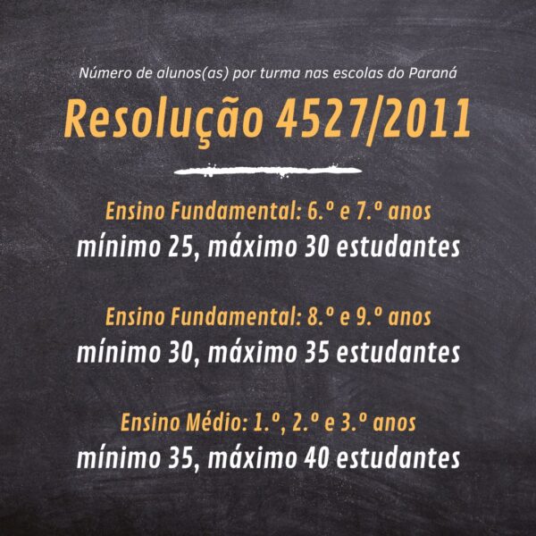 Em vigor desde 31 de outubro de 2011, a Resolução 4527/2011 estabelece o número de estudantes para efeito de composição de turmas nas unidades de ensino fundamental, médio e superior e os cursos livres no estado do Paraná.
