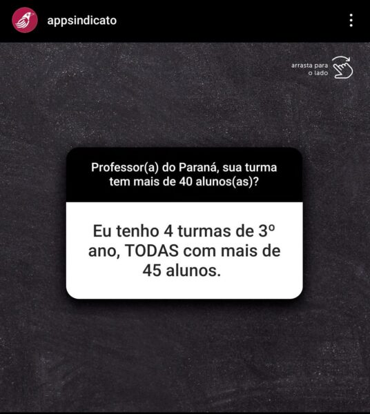 Após a repercussão da nota do governo, a APP-Sindicato criou uma caixinha no Instagram com a pergunta: Professor(a) do Paraná, sua turma tem mais de 40 alunos(as)?