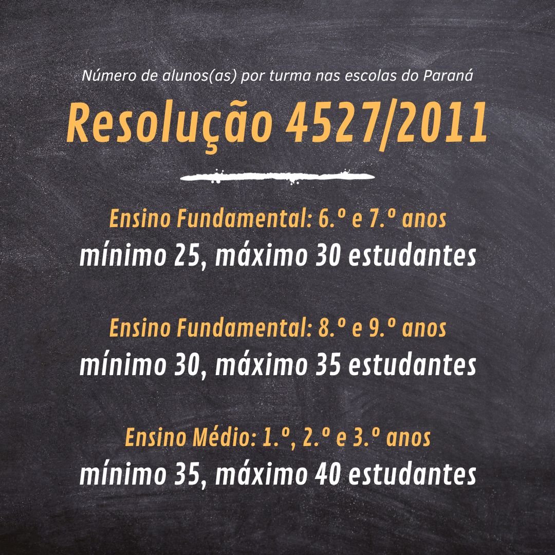 Em vigor desde 31 de outubro de 2011, a Resolução 4527/2011 estabelece o número de estudantes para efeito de composição de turmas nas unidades de ensino fundamental, médio e superior e os cursos livres no estado do Paraná.