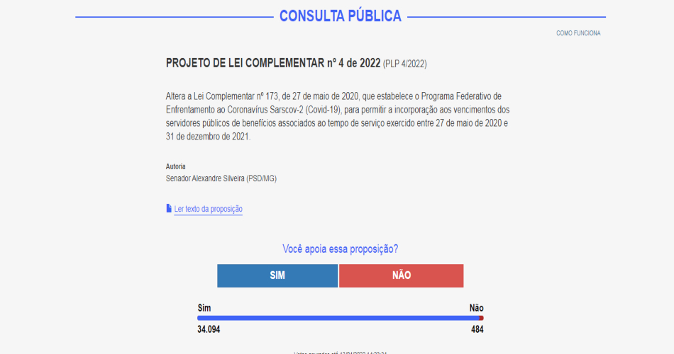 O Senado Federal abriu nesta quarta-feira (13), uma consulta pública sobre a PLP 04/2022, projeto que pretende revogar o Artigo 8º da Lei Complementar (LC 173/2020), que congelou a contagem do tempo de direitos dos(as) servidores(as) durante a pandemia.