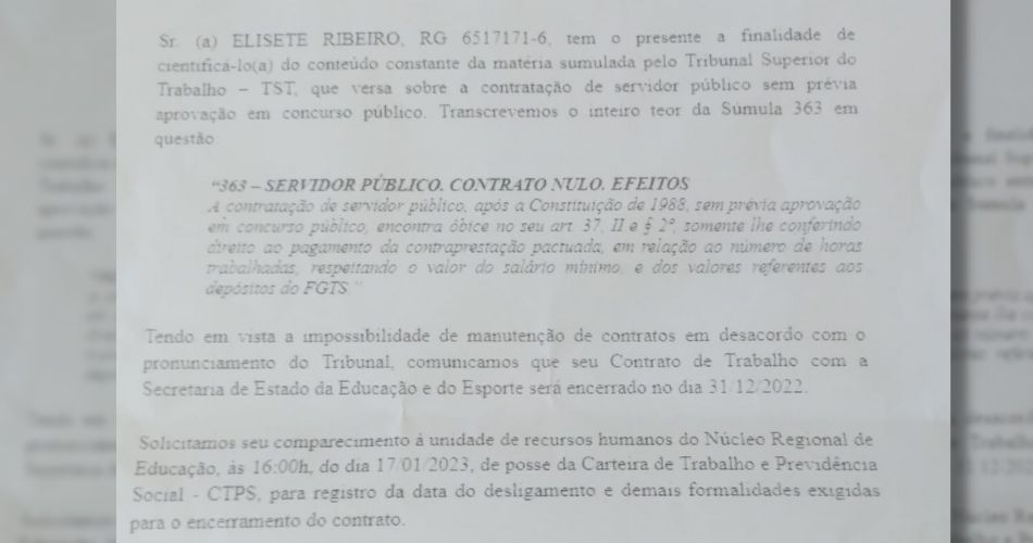 Em março do 2023, a funcionária de escola Tereza Aparecida Barbosa completaria a idade e o tempo de serviço necessários para se aposentar. Nesta segunda (21), ela recebeu do governo Ratinho Junior um comunicado anunciando a sua dispensa do Estado.
